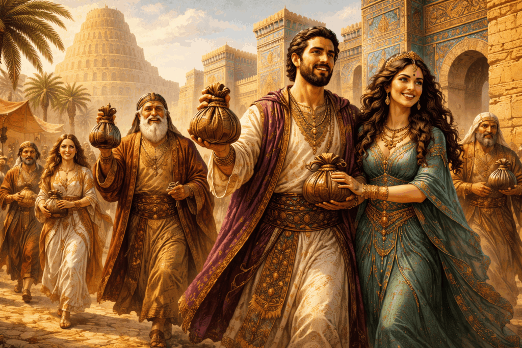 В конце дается короткий взгляд на Вавилон как на богатый и влиятельный город древности: торговля, ремесла, деньги, законы и порядок. Этот фон закрепляет ощущение, что описанные правила появились не из абстракции, а из жизни города, где умеют считать и ценят труд. Исторический штрих работает как рамка: место меняется, а логика денег остается узнаваемой.